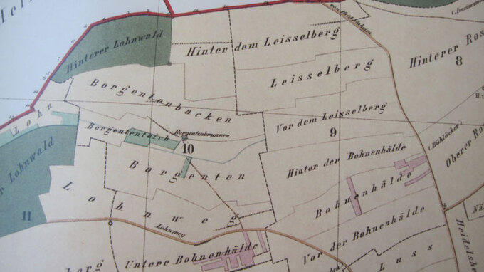 Auf einer Gemarkungskarte der Gemeinde Neibsheim aus dem Jahre 1865 ist der Borgentenbrunnen als kleiner Tümpel mit Gebüsch umwachsen eingezeichnet. Eine große von Nordwesten kommende Hecke endet an der Quelle.