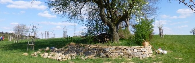 Auf der über zwei Hektar großen Wiese pflegt der Arbeitskreis Streuobst über 200 Obstbäume. Hier werden von 50 lokalen und alten Sorten je 2 Bäume erhalten. Die Stammhöhe liegt bei 1,80 m, denn sonst bleibt der Grünspecht fern, der Nach- mieter wie Fledermäuse, Hornissen, Steinkauz, Gar- tenrotschwanz und Halsbandschnäpper anzieht.