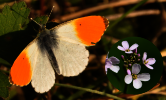 Wenn das Wiesenschaumkraut (Cardamine pratensis) blüht, fliegt der hübsche orange-weiße Aurorafalter (Antocharis cardamines). Von April bis Juni überzieht das Schaumkraut wegen seines oft massenhaften Auftretens feuchte Wiesen mit seinen unzähligen, kleinen Blüten mit einem zarten Hauch violett – und spielt im Lebenszyklus des Aurorafalters eine zentrale Rolle. Die kleinen Frühjahrsfalter fliegen von Anfang April bis Mitte Juni in nur einer Generation. Sie bevorzugen feuchte Lebensräume entlang von Waldwegen, Wiesenrändern, Bachufern, kleinen Feuchtgebieten und Naturgärten. Unverwechselbar sind die Männchen mit ihren orangeroten Vorderflügeln und ihrem Verhalten: Rastlos fliegen sie auf der Suche nach Blüten dicht über dem Boden umher und legen nur kurze Stopps zum Nektarsaugen ein. An Ufern und Saumstrukturen suchen sie mit regelrechten Kontrollflügen nach paarungsbereiten Weibchen und fliegen dabei alles an, was danach aussieht. Aurora-Weibchen sind unscheinbar weiß mit schwarzen Zeichen gefärbt und leicht mit Weißlingen zu verwechseln. Beide Geschlechter haben an der Hinterflügelunterseite eine olivgrüne Marmorierung, die der Tarnung beim Blütenbesuch dient.