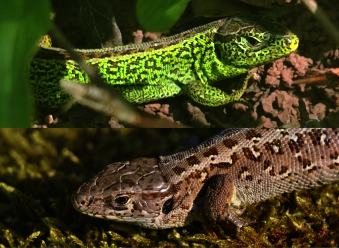 Leuchtend grün sind bei der Zauneidechse nur die Männchen zur Paarungszeit, die Weibchen sind schlicht graubraun gefärbt. Der braune Rücken trägt bei beiden Geschlechtern dunkle Flecken und weiße Linien. Zudem finden sich schwarze, rotrückige und nahezu ungezeichnete Tiere. Die Körperläge ist mit bis zu 22 Zentimetern beeindruckend, 12 Zentimeter davon entfallen auf den Schwanz.